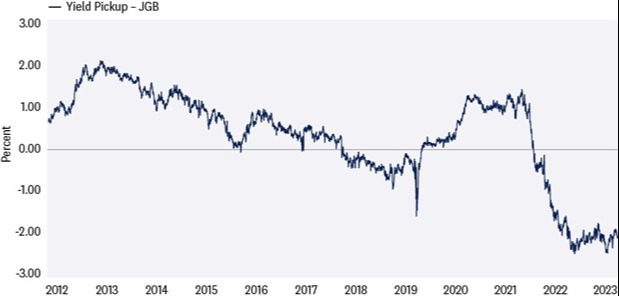 Difference in 10-year Foreign Treasury Yield vs. 10-Year U.S. Treasury Yield Hedged to Foreign Currency