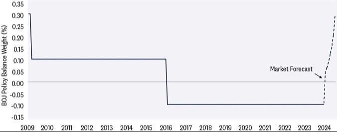 Since 2016, the main policy rate for the BOJ has been stuck at -0.10%. But with improved wage negotiations, markets are expecting a 0.10% rate hike this week from the BOJ, the first hike since 2007. Additionally, markets expect the main policy rate to climb to 0.25% by year-end.