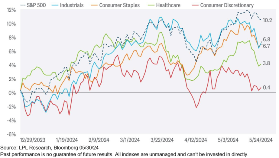 It all comes down to performance, and the consumer discretionary and healthcare sectors have consistently lagged the broader market this year. Higher inflation and interest rates have weighed on the outlook for consumer spending as excess savings have largely been spent, while weakness in the managed care space due to disappointing government Medicare Advantage payments and lower COVID-19-related sales have acted as drags on the broader healthcare sector. Consumer staples have been a growing beneficiary of defensive positioning and a more price-conscious consumer. The industrials sector has largely kept up with the broader market for most of the year, benefiting from increased infrastructure spending, re-shoring activity, and defense spending. Industrials are also a backdoor artificial intelligence (AI) play given their role in data center construction and maintenance.