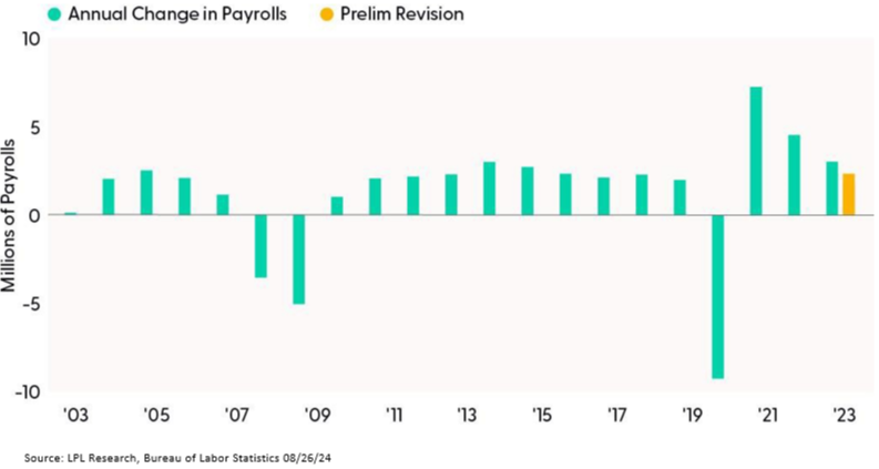 Revisions occur because additional surveys come in and labor analysts cross-check their estimates with other corresponding metrics. The final benchmark revisions will be published in February next year. But for now, the key takeaway is the labor market appears weaker than originally reported. And a deteriorating labor market will allow the Fed to highlight both sides of the dual mandate. If future monthly payroll reports come in weak, investors should prepare for multiple cuts this year.