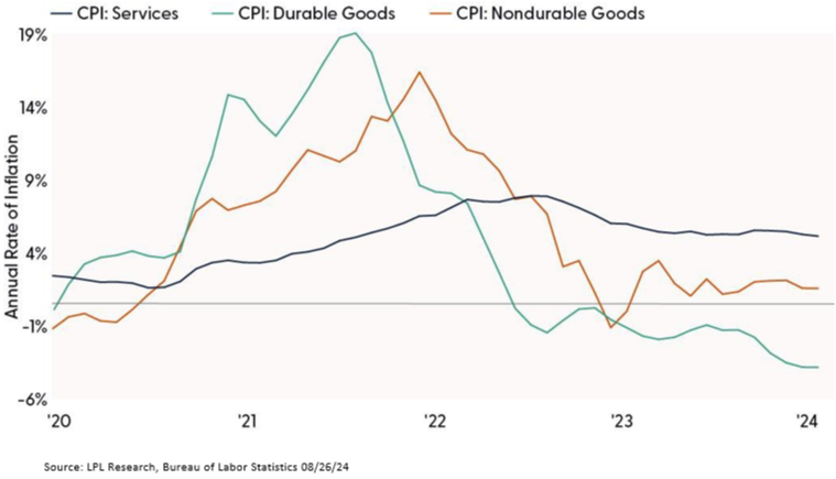 Consider your bond allocations, as rates will likely fall from here. From an investment perspective, LPL’s Strategic and Tactical Asset Allocation Committee (STAAC) maintains its neutral stance on equities, while actively monitoring economic data, corporate profits, and technical analysis signals. We expect volatility to remain elevated in the coming months as the market waits for more clarity on the economy, elections, and a better seasonal setup. The STAAC maintains its modest overweight to fixed income, funded from cash, which can help buffer against equity market volatility should economic conditions worsen, while also providing attractive income. The stickiness of services inflation continues to be one variable that could lead to volatility if inflation risks flare up.