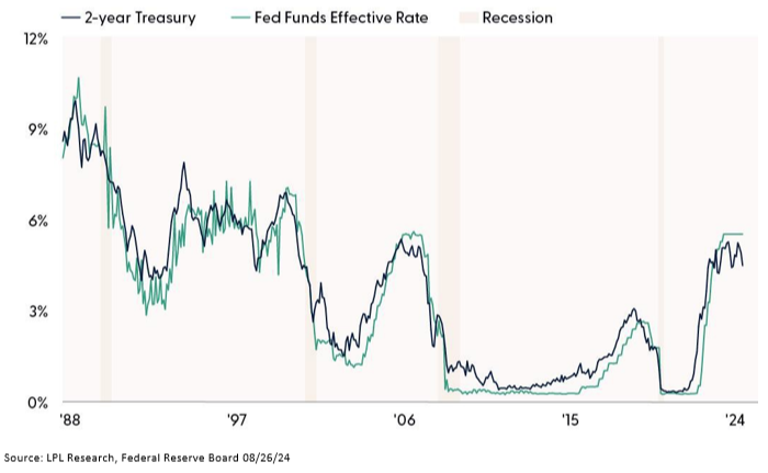One of the underappreciated concepts in Powell’s speech is the current data shows an evolving macro landscape. The jury is still out on whether the Fed can successfully manage the risks to both sides of their dual mandate. However, Chairman Powell could not be clearer — “the time has come for policy to adjust” and yields on the 2-year Treasury anticipate the cuts as highlighted in the “Fed Positioning Toward a Series of Cuts” chart. Given the Fed’s attention to protecting and preserving the labor market, a soft landing looks achievable, barring any shocks.