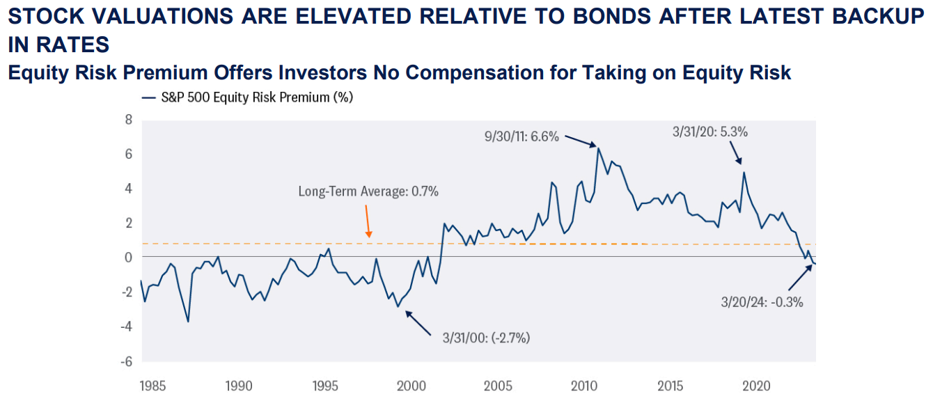 With the Federal Reserve’s (Fed) aggressive rate-hiking campaign of 2022-2023 behind us, we have entered 2024 with an equity risk premium (ERP) slightly below zero. The ERP compares the earnings derived from equities to the income (or yield) offered by high-quality fixed income. A near-zero ERP is a far cry from the 5% level back in March of 2020 at the depths of the pandemic lockdown when the Fed took its target rate to zero and the 10-year yield plummeted to the lowest levels ever recorded near 0.5%. Equities offered tremendous strategic value back then, but less so now.