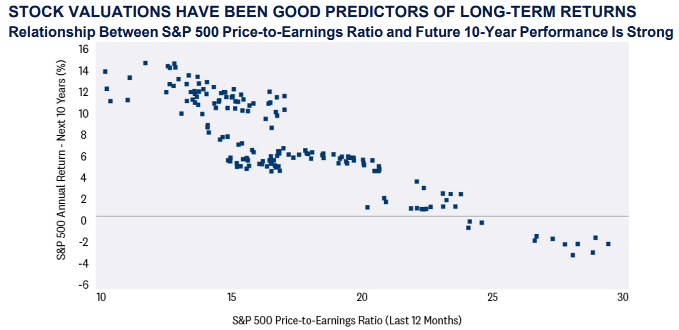 The accompanying chart illustrates the relationship between the price-to-earnings ratio (P/E) for the S&P 500 Index and subsequent 10-year annualized returns. The dot formation from the upper left of the scatterplot chart to the lower right tells us that higher P/Es often precede weaker long-term stock market returns, while lower P/Es tend to be followed by stronger long-term performance.