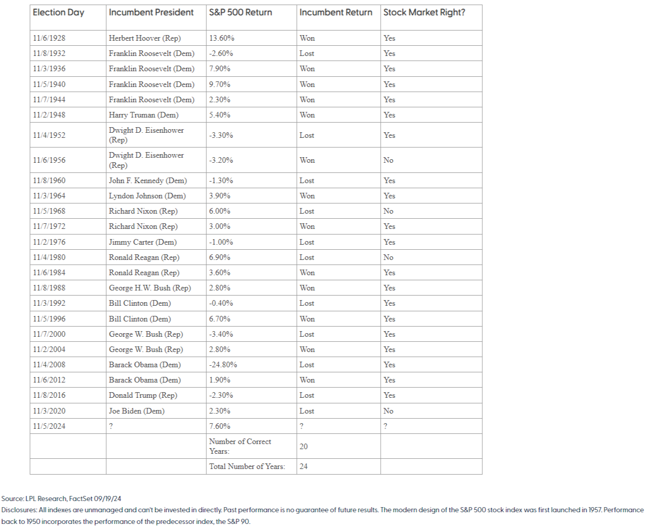 It’s hard to mention policy and the election without referencing one of the stock market’s more popular and accurate election predictors. Historically, the stock market has been a surprisingly accurate and unbiased election forecaster. Since 1928, if the S&P 500 was positive in the three months leading up to an election, the incumbent party remained in control of the White House 80% of the time (12 of 15 elections). Conversely, a declining market in the same period usually signaled a loss for the incumbent —occurring in eight of the last nine elections.