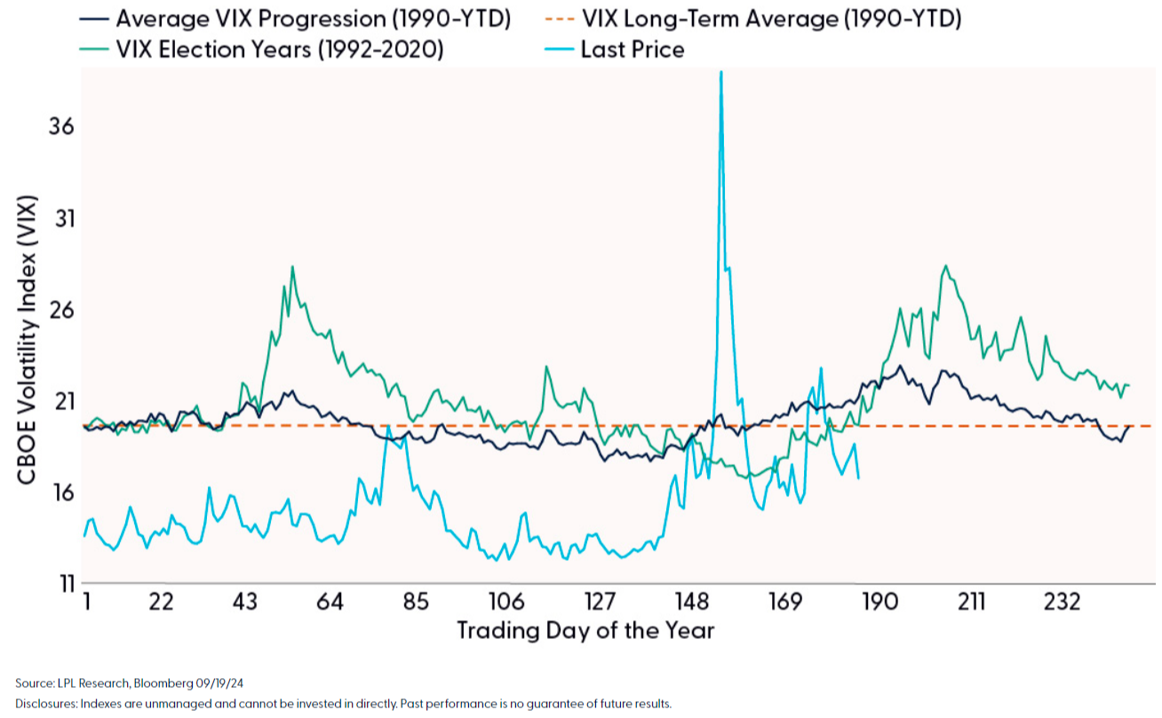 Stocks tend to be more volatile during election years, particularly within the three-month window before Election Day, as the accompanying chart illustrates. The CBOE Volatility Index (VIX) measure of implied market volatility (based on prices for index options) typically rises at this time of year, but the increase in volatility is more pronounced during election years.