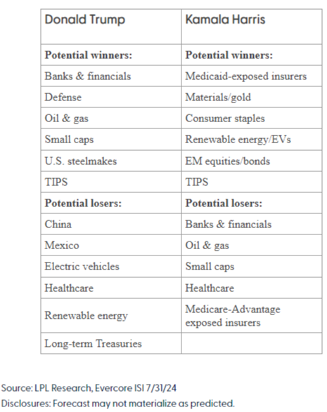 Of the potential winners below, we believe renewable energy/electric vehicles (EV) and Medicaid-exposed insurers may be the most likely beneficiaries in a Harris administration, while U.S. steelmakers and oil and gas could be the most likely beneficiaries in a Trump administration. On the downside, a Trump administration may be the most detrimental to China’s economy and its companies, while a Harris administration would perhaps weigh the most heavily on the traditional oil and gas segment. LPL Research will be providing much more on the election in the weeks ahead.
