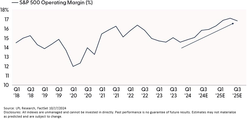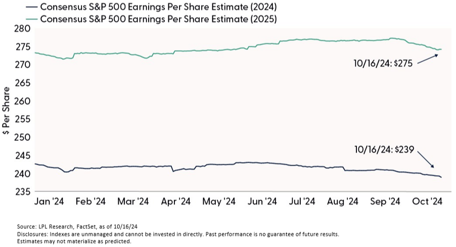 What’s different about this quarter is how high valuations are. At a forward price-to-earnings ratio (P/E) of 22, currently, stock valuations are near 25-year highs. So, $275 is the number to watch. That’s the consensus estimate for S&P 500 EPS in 2025. We would consider a 2% cut in estimates to around $270 to be the base case — remember, estimates almost always come down as companies report results. If estimates end up falling less than that, valuations may hold up. Of course, the election and geopolitics are big wild cards. Still, we cannot overstate the importance of the earnings outlook for stocks to maintain these elevated valuations.