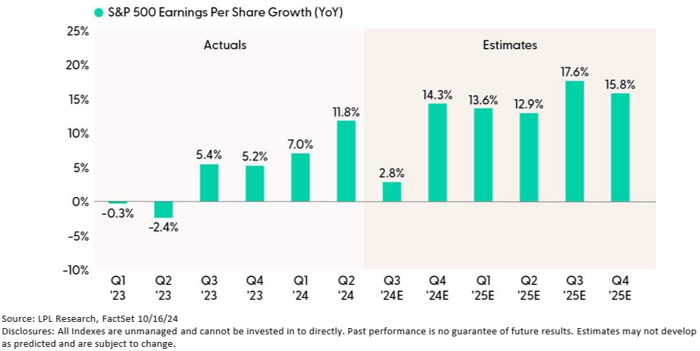 Risks to the downside include a potential slowdown in the U.S. economy; continued sluggish growth in China (even with some stimulus), and potential tariff increases post-election. In 2026, higher corporate tax rates become a risk, though that will not show up in 2025 earnings. LPL Research maintains its below-consensus S&P 500 EPS forecast for 2025 at $260, representing growth of 8%. (Our 2024 S&P 500 EPS forecast at $240 may end up a dollar or two high.)