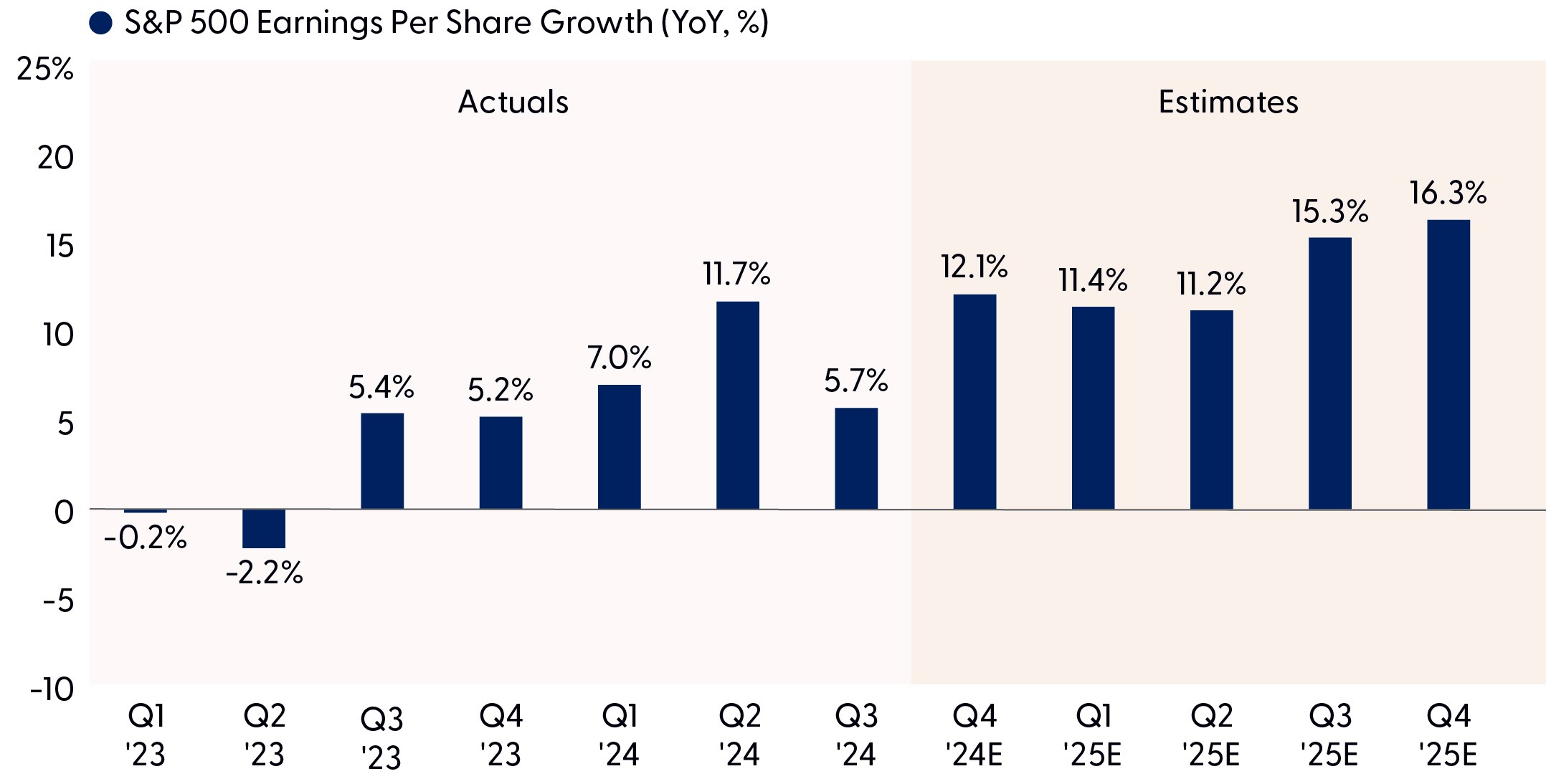 As we wrote in ourOutlook 2025: Pragmatic Optimism, we believe corporate America has an excellent chance to deliver double-digit earnings growth in 2025 and even exceed our forecast for S&P 500 EPS of $260 per share. Broadly, corporate America will get help from artificial intelligence (AI) investment and related productivity gains. Banks and energy companies should benefit from deregulation in Washington, D.C. Economic growth, though likely to slow, may come in around 2%, if not higher, setting up revenue growth in the 4–5% range when factoring price increases in (remember GDP is reportedwithoutinflation, but company revenue is nominal, meaning it includes inflation).