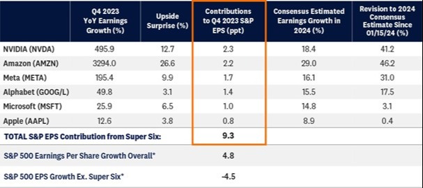 The numbers speak for themselves. Removing Tesla, which experienced a drop in earnings in the fourth quarter, the Super Six drove more than nine percentage points of earnings contribution for the S&P 500. More specifically, S&P 500 earnings per share would have declined 4.5% in the quarter if not for these six companies. Add them in and that decline becomes a 4.8% increase.