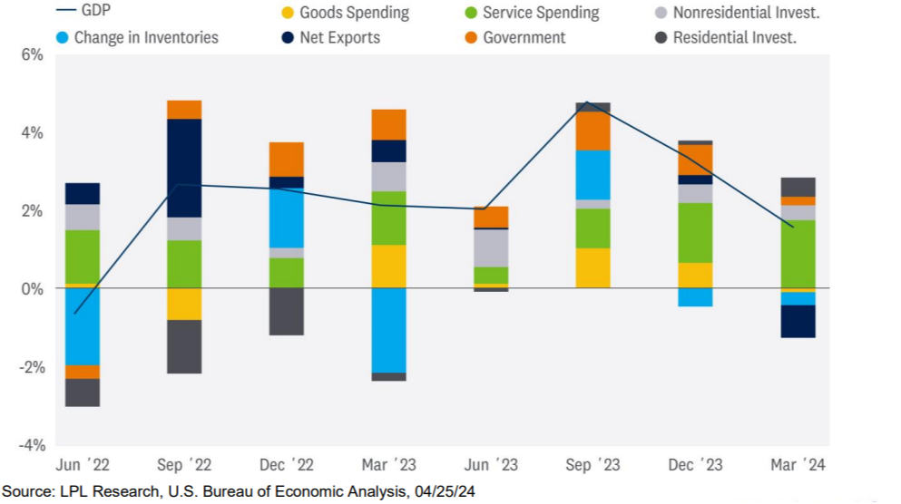 The overall domestic economy grew 1.6% annualized in the first quarter, dragged down by inventories and trade. Consumer spending continued to hold up well with an annualized increase for the quarter of 2.5%, though that was shy of expectations near 3%. Consumers did pull back on goods purchases and focused on the demand for services in an economy still recovering from the pandemic shock.