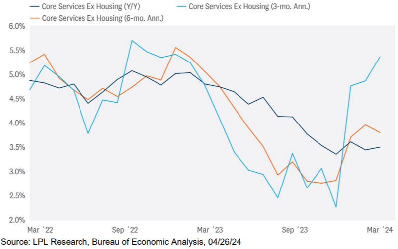 - Inflation for services and goods are on two very different glide paths. Annual services inflation was 4% in March, but goods inflation was roughly flat. We will continue to watch services inflation closely.