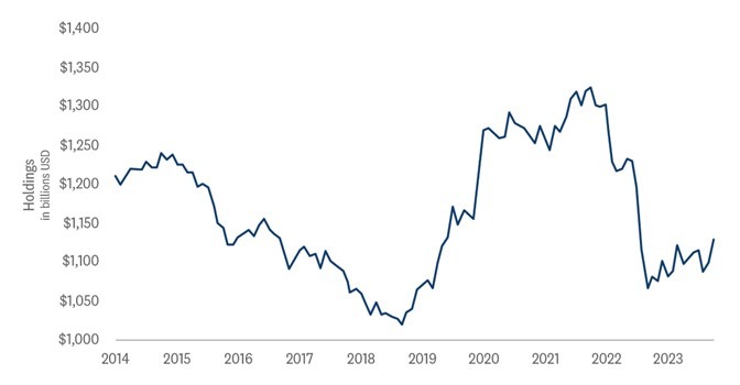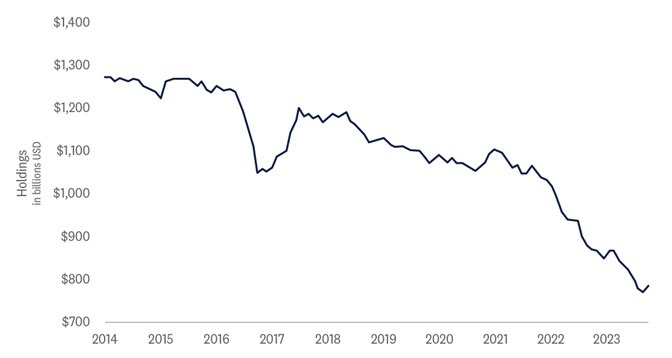 But with the amount of Treasury debt that will likely come to market over the next few years (few decades?), the Treasury department will likely need to find additional demand. The current Treasury buyer base is diverse, with non-domestic buyers and the Fed serving as the largest owners of Treasury securities. However, the largest owner of Treasuries, the Fed, is shrinking its sizable balance sheet and is letting $60 billion of Treasury securities roll off each month (though debt that matures above the $60 billion threshold is currently being reinvested in Treasury securities). Currently, the Fed owns slightly more than $5 trillion in Treasury securities, or roughly 25% of issuance, but is on pace to reduce its exposure by several trillion by the end of 2024. While the Fed will likely not be able to get its balance sheet back to pre-COVID-19 levels, it likely won’t be a large buyer of Treasury securities in the near term either (unless an unforeseen macro event causes the Fed to implement quantitative easing again). So, the biggest buyer of Treasuries is likely on the sidelines for now.