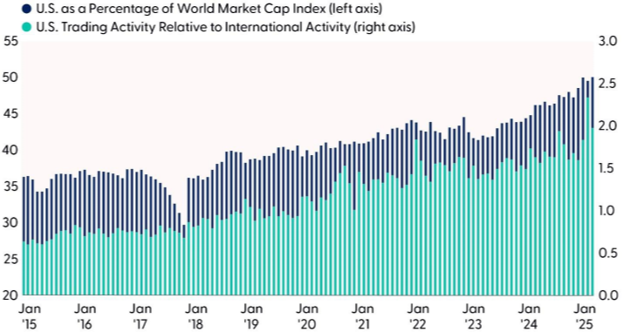U.S. exceptionalism remains for several fundamental reasons. The dollar maintains its status as the world's reserve currency. Despite attempts by rivals and complaints from allies, the dollar remains dominant, used in nearly half of global transactions. The role of domestic markets also helps define exceptionalism. As of early 2025, the total market capitalization of the U.S. stock market was approximately $62.2 trillion. The global stock market's total market capitalization was around $116 trillion, which means the U.S. market cap represents over half of the world's total market capitalization.